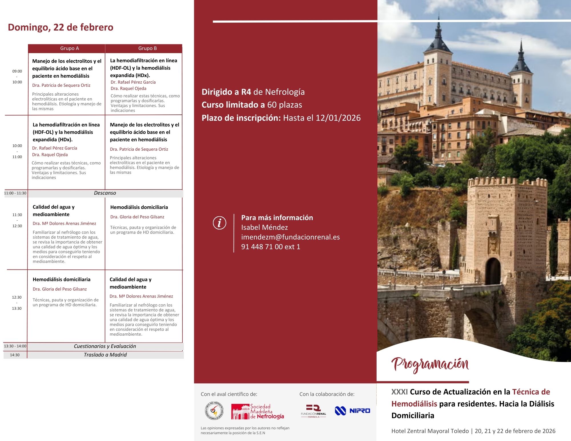 Un total de 53 alumnos MIR residentes de nefrología de cuarto año participaron este fin de semana en el XXXI Curso de Actualización en la Técnica de Hemodiálisis para residentes. Hacia la Diálisis Domiciliaria, celebrado en el Hotel Zentral Mayoral de Toledo. La jornada ha sido inaugurada por Fabiola Dapena, directora médica y de atención psicosocial de la Fundación Renal Española, Milagros Fernández Lucas, jefe de servicio de nefrología del Hospital Ramón y Cajal y Emilio González Parra, nefrólogo del Hospital Universitario Fundación Jiménez Díaz, y contó con la participación de un total de catorce profesores procedentes de hospitales de referencia de toda España, entre ellos la directora asistencial de la Fundación Renal Española, Dolores Arenas.