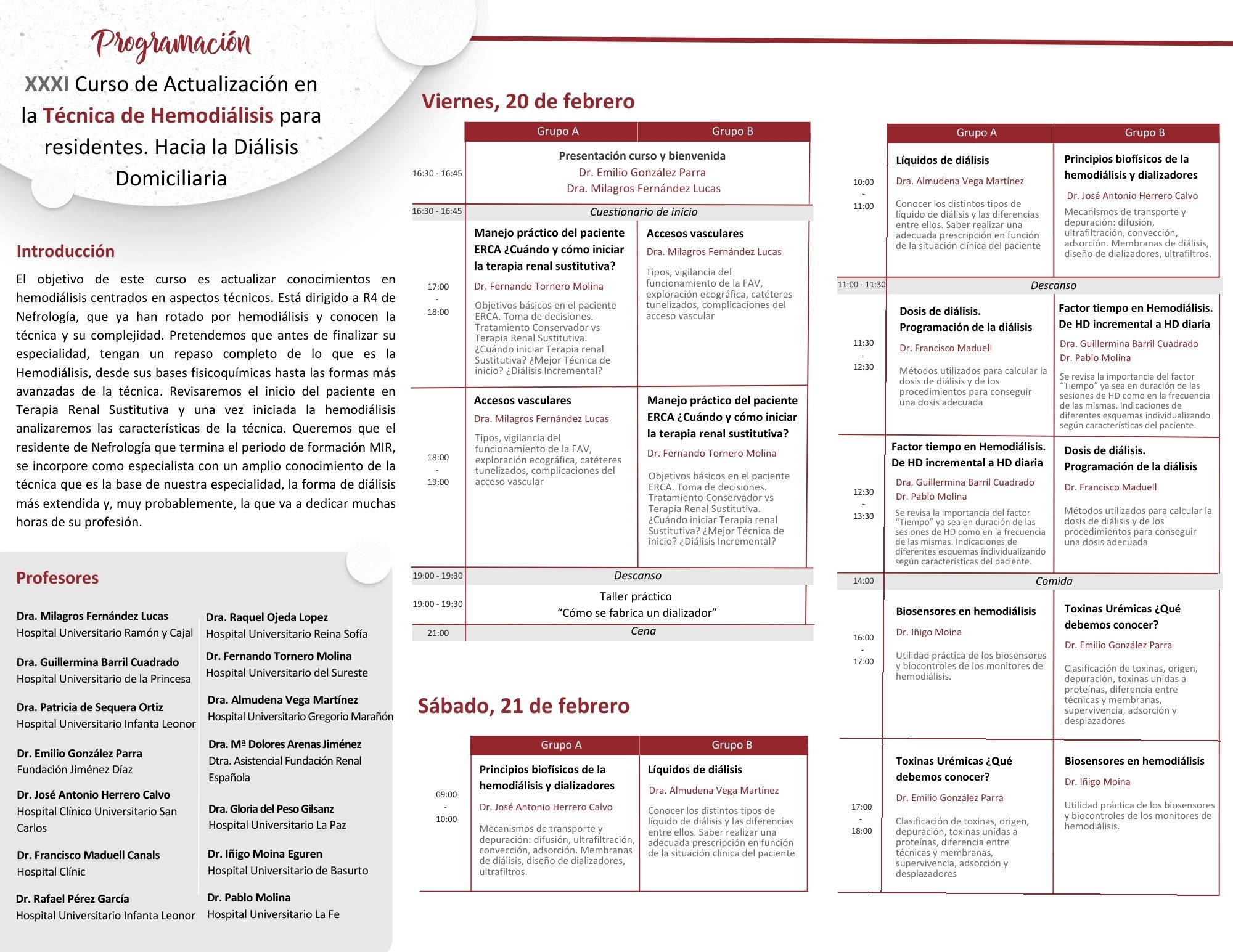 El programa recogió todos los aspectos relacionados con el tratamiento de hemodiálisis, desde el manejo de los pacientes al iniciar una terapia renal sustitutiva, hasta la organización de un programa de hemodiálisis domiciliaria. Algunos de los asuntos que se abordaron en estas jornadas fueron: los accesos vasculares, los distintos tipos de líquido de diálisis, los biosensores y las toxinas urémicas. Además, los alumnos pudieron aprender sobre los principios biofísicos de la hemodiálisis y dializadores, los procedimientos para conseguir la dosis adecuada de diálisis, la importancia del factor tiempo en hemodiálisis —desde la HD incremental a la HD diaria— y las alteraciones electrolíticas y del equilibrio ácido-base. También se profundizó en las técnicas de hemodiafiltración en línea (HDF-OL) y la hemodiálisis expandida (HDx), abordando cómo programarlas, dosificarlas, así como sus ventajas, limitaciones e indicaciones.