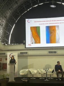 Por su parte, la supervisora Elena Guerrero presentó un estudio a gran escala —más de 81.000 sesiones analizadas— sobre los factores determinantes para la correcta punción de las FAV. Los resultados mostraron que la incidencia de repunciones es baja y se asocia a fístulas protésicas, profundas o de reciente creación, a la canalización en dirección retrógrada y, curiosamente, a una mayor antigüedad del profesional enfermero.