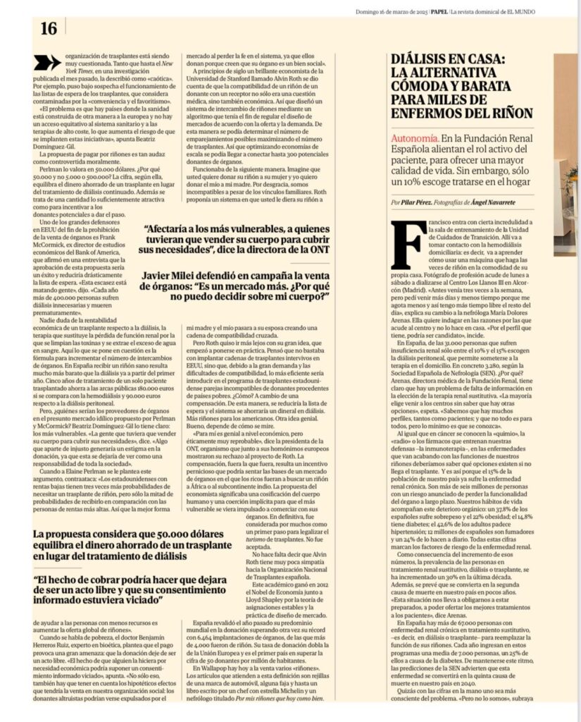 propia casa. Fotógrafo de profesión acude de lunes a sábado a dializarse al Centro Los Llanos III en Alcorcón (Madrid). «Antes venía tres veces a la semana. pero pedí venir más días y menos tiempo porque me agota menos y así tengo más tiempo libre el resto del día», explica su cambio a la nefróloga María Dolores Arenas. Ella quiere indagar en las razones por las que acude al centro y no lo hace en casa. «Por el perfil que tiene, podría ser candidato», incide.