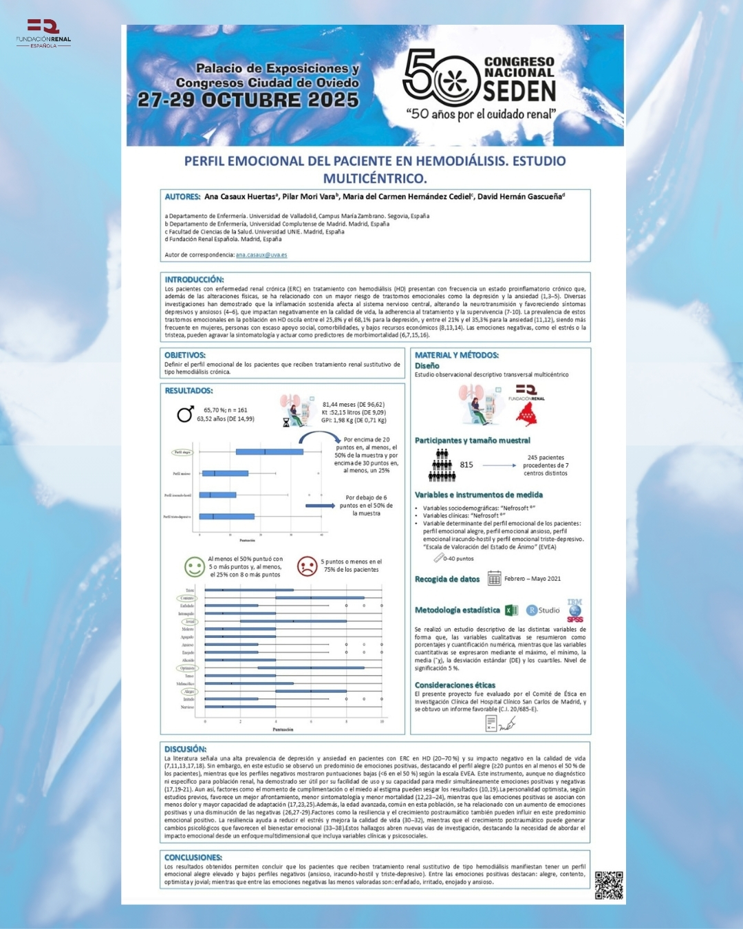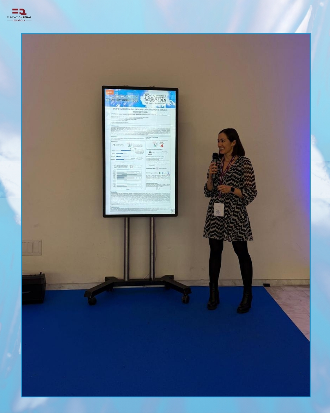 Ana Casaux, enfermera, ha presentado dos pósteres en el congreso. El primero recoge el estudio Perfil sintomático del paciente en hemodiálisis. Ha explicado que la enfermedad renal crónica afecta la calidad de vida y aumenta la aparición de síntomas físicos y emocionales. Para analizarlo, se ha realizado un este estudio transversal en 245 pacientes en hemodiálisis identificó que los síntomas más frecuentes fueron dolor, debilidad y problemas para dormir. La edad y el tiempo en diálisis se relacionaron con un mayor reporte sintomático. Un mayor Kt tuvo un efecto protector, mientras que la ganancia de peso interdiálisis y un mayor índice de comorbilidad se asociaron con peor sintomatología. Además, se ha estudiado también el Perfil emocional del paciente en hemodiálisis con 245 pacientes en hemodiálisis mediante la escala EVEA. Los resultados mostraron predominio de emociones positivas, destacando un perfil alegre, optimista y jovial. Las emociones negativas, como enfado o ansiedad, fueron poco frecuentes. En conjunto, los pacientes presentaron un elevado predominio de perfil emocional positivo.