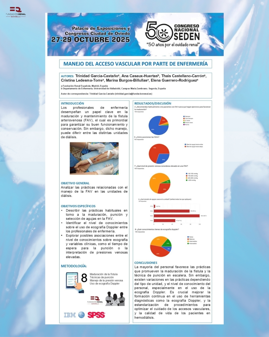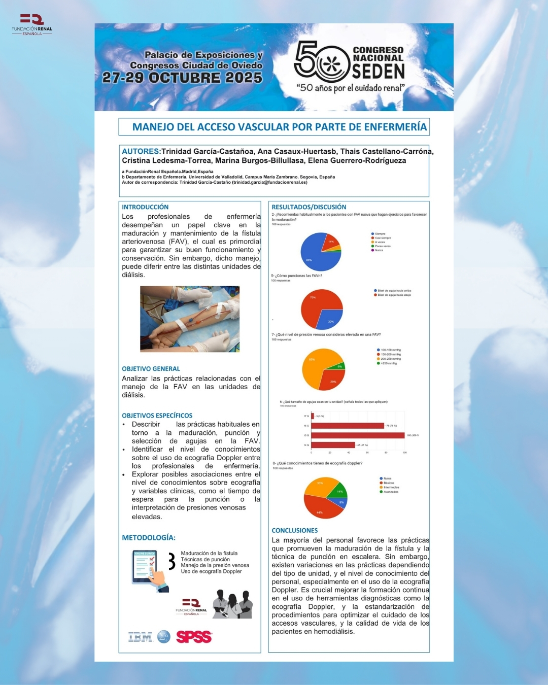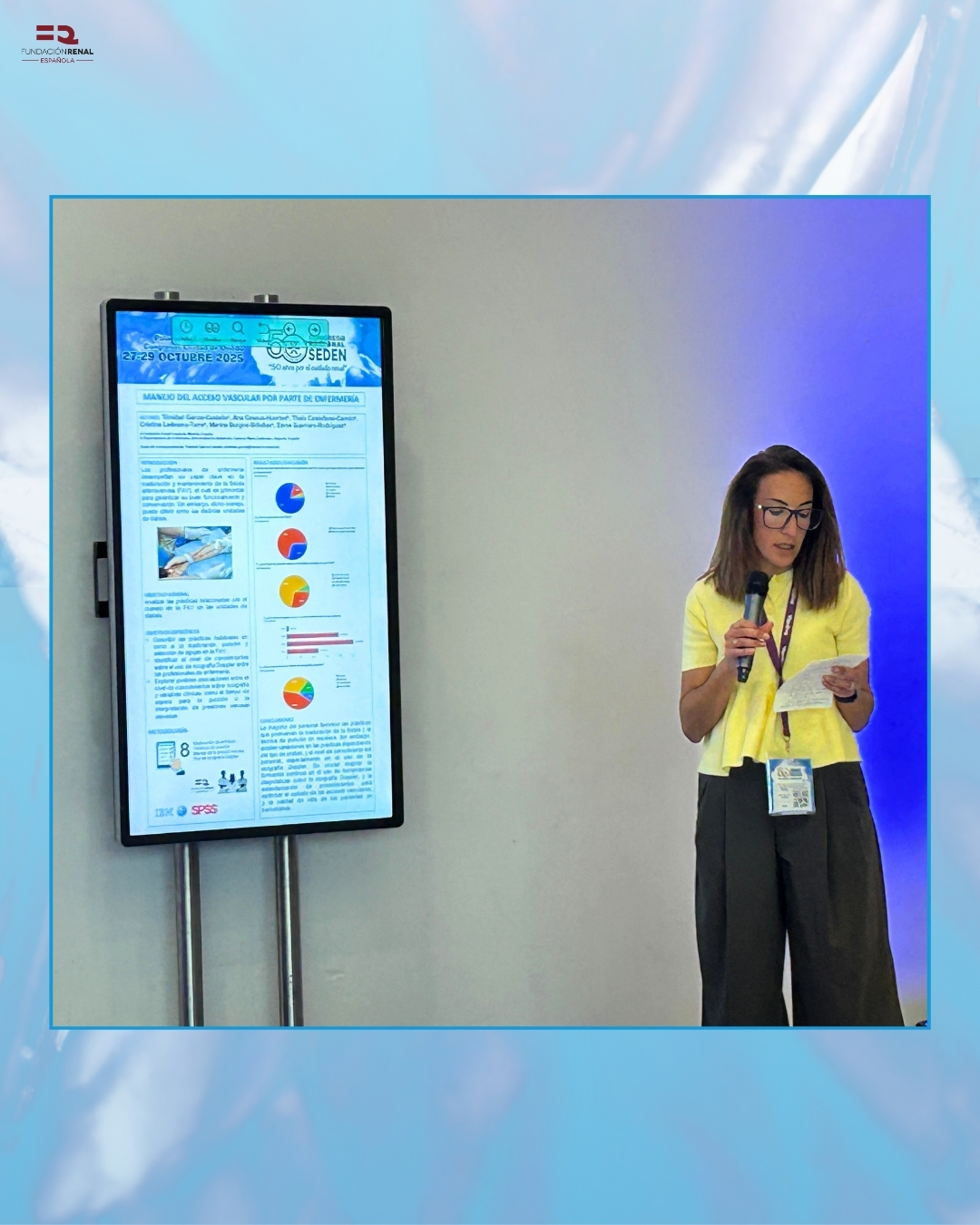 El segundo trabajo que ha presentado en la SEDEN ha acercado uno de los retos de la hemodiálisis: la negativa de los pacientes a crear una fístula arteriovenosa. Con el Proyecto ERCAV. Papel relevante de la enfermería en la toma de decisiones sobre el acceso vascular en pacientes renales, la Unidad de Investigación de la Fundación ha llevado a cabo un estudio multicéntrico con 51 pacientes. Los resultados demostraron que una intervención enfermera estructurada, basada en educación visual, mapeo ecográfico y comunicación empática, aumenta la aceptación de la fístula arteriovenosa hasta el 69%. El impacto fue mayor en pacientes ERCA (100%) y menores en prevalentes con CVC>6m (35%, p<0,001). La enfermería se consolida como pieza clave en la toma de decisiones compartidas y en la mejora de la calidad asistencial en nefrología.