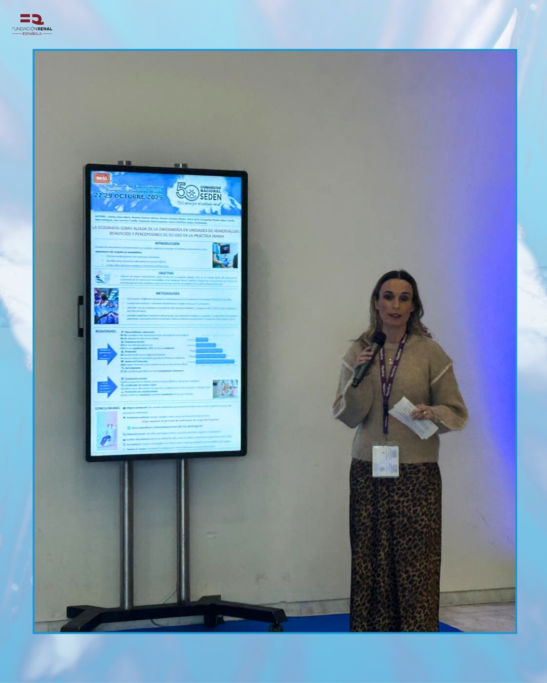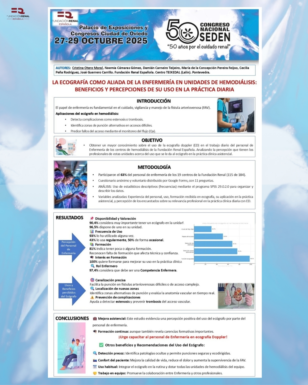 Cristina Otero, supervisora del centro Teixedal de Lalín, ha participado en el congreso con un póster que recoge el estudio La ecografía como aliada de la enfermería en unidades de hemodiálisis: beneficios y percepciones de su uso en la práctica diaria. La Unidad de Investigación de la Fundación ha analizado la percepción del personal de enfermería sobre el uso del ecógrafo en hemodiálisis, destacando su impacto positivo en la calidad asistencial y la seguridad del paciente. A pesar de su disponibilidad en la mayoría de las unidades, muchas enfermeras lo utilizan poco por falta de formación y práctica. El 93% lo ha usado alguna vez, pero solo el 43% de forma regular, y más del 80% reconoce necesitar mayor capacitación. Los principales usos son la punción ecoguiada, la detección de estenosis y el mapeo del acceso vascular. A pesar de que existe una actitud favorable hacia el ecógrafo, el estudio revela una clara necesidad de fortalecer la formación enfermera para optimizar su integración clínica.
