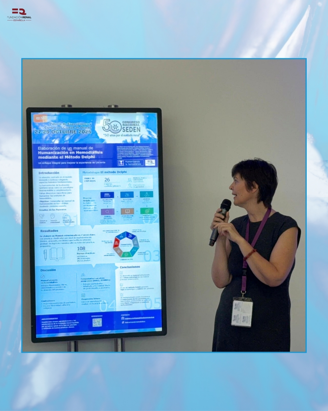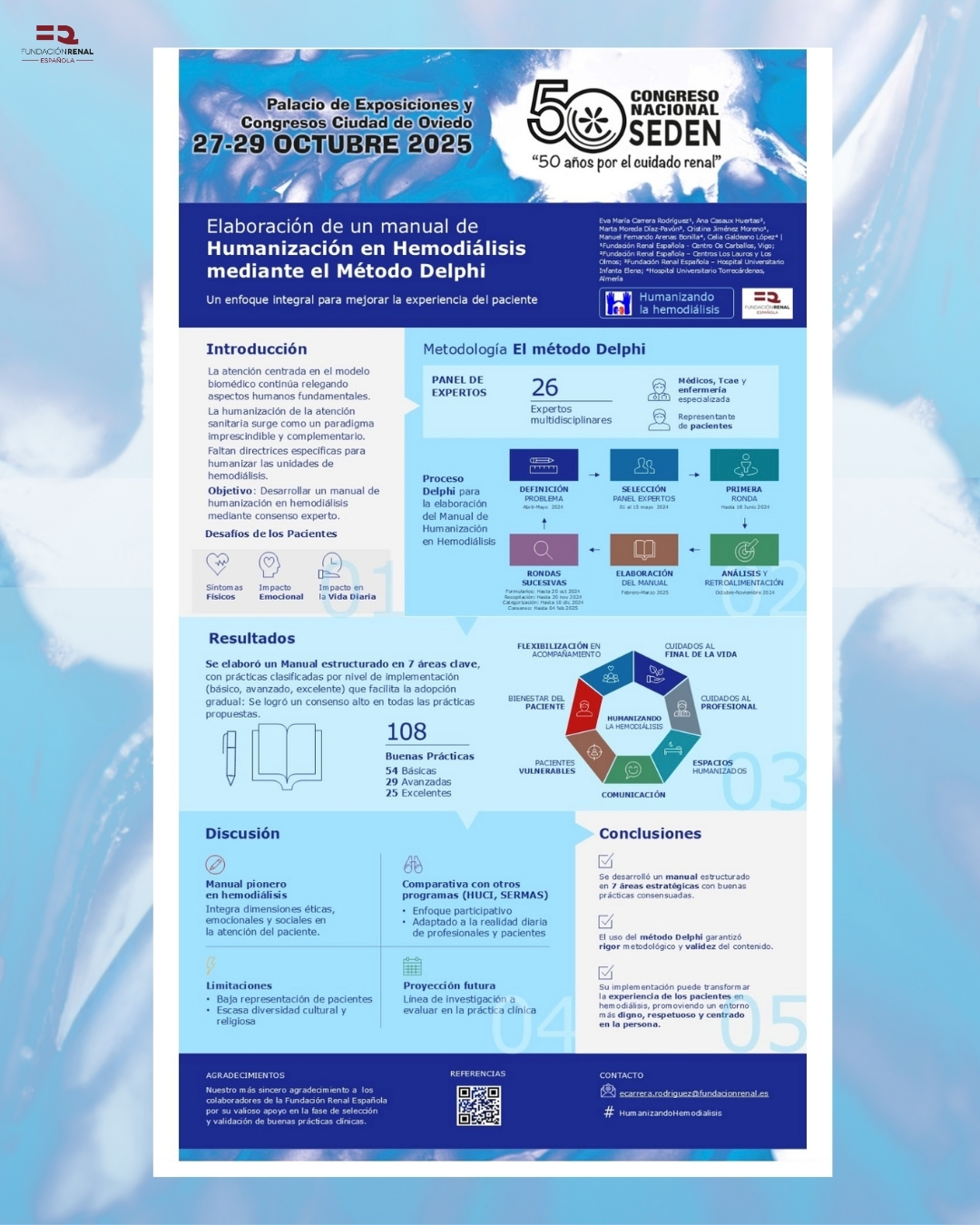 Eva Carrera, enfermera, ha explicado la Elaboración de un manual de humanización en hemodiálisis mediante el método Delphi: un enfoque integral para mejorar la experiencia del paciente en las unidades de hemodiálisis. Para ello, se aplicó el método Delphi con un panel multidisciplinar, alcanzando consenso tras varias rondas. El manual resultante abarca siete áreas clave como comunicación, cuidados al profesional y pacientes vulnerables. Cada área incluye prácticas validadas según su factibilidad. Esta guía tiene como objetivo mejorar la atención, promoviendo un entorno más humano y centrado en el paciente.