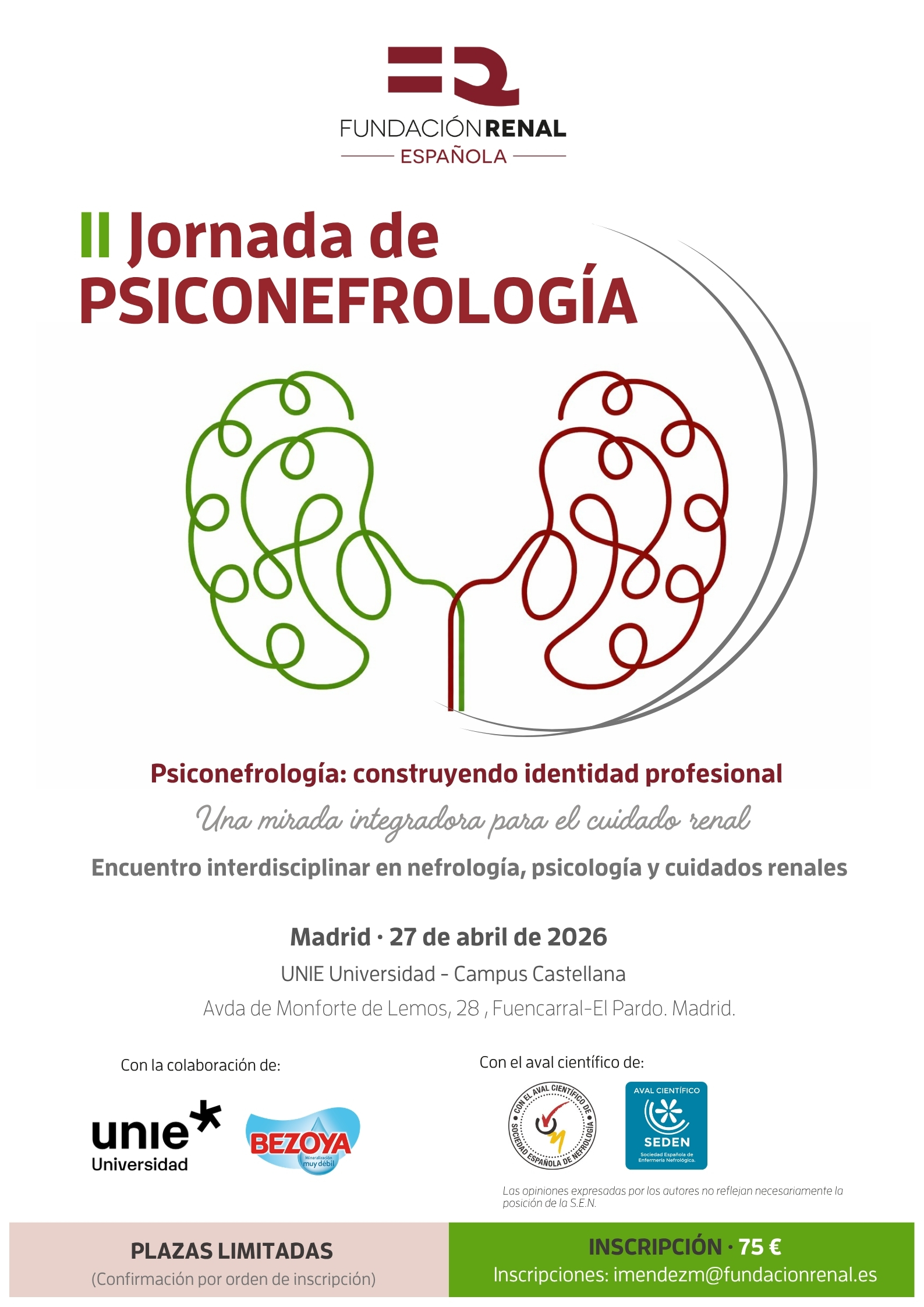 La II Jornada de Psiconefrología que tendrá lugar el lunes 27 de abril en Madrid cuenta con la colaboración de la UNIE Universidad que acoge esta segunda edición en su Campus de Castellana. El coste de inscripción es de 75€ por persona y el plazo para apuntarse finaliza el 24 de abril o cuando se agoten las plazas.