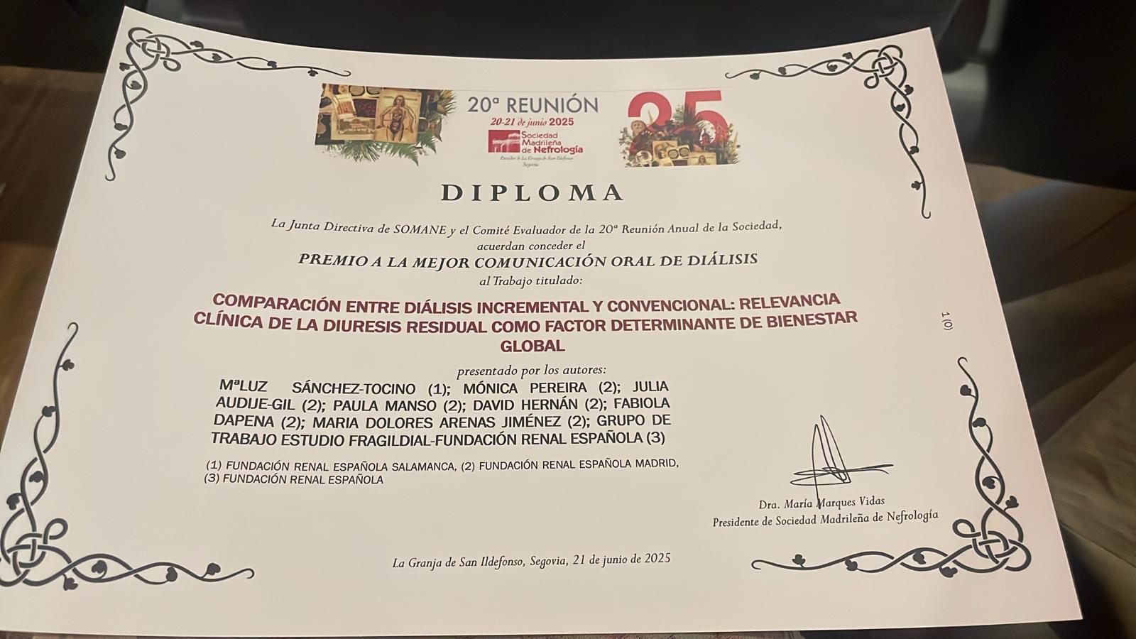 La Unidad de Investigación de la Fundación Renal Española ha recibido el premio a la mejor comunicación oral por una de las investigaciones presentados durante la 20ª Reunión Anual de la Sociedad Madrileña de Nefrología (SOMANE) celebrada en La Granja de San Ildefonso, Segovia