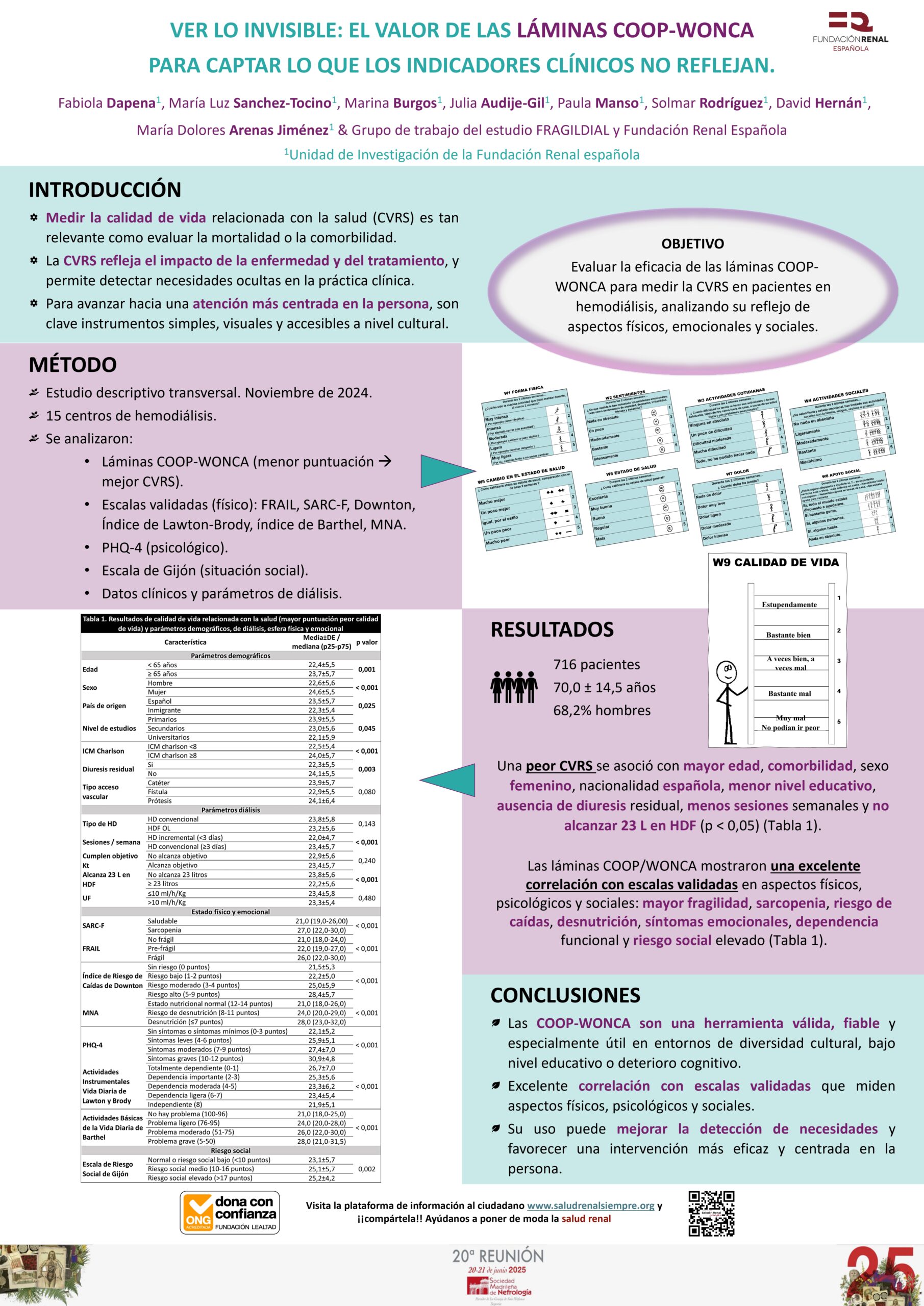 El segundo destacaba la importancia de Ver lo invisible: el valor de las láminas COOP/WONCA para captar lo que los indicadores clínicos no reflejan. Estas láminas se usaron para medir la calidad de vida relacionada con la salud (CVRS) en 716 pacientes en hemodiálisis. Se encontró que una peor CVRS se asociaba con mayor edad, comorbilidad y factores sociales como bajo nivel educativo. Las láminas mostraron una fuerte correlación con escalas validadas que miden aspectos físicos, psicológicos y sociales, lo que confirma su utilidad como herramienta sencilla y eficaz para identificar necesidades ocultas y mejorar la atención centrada en la persona.