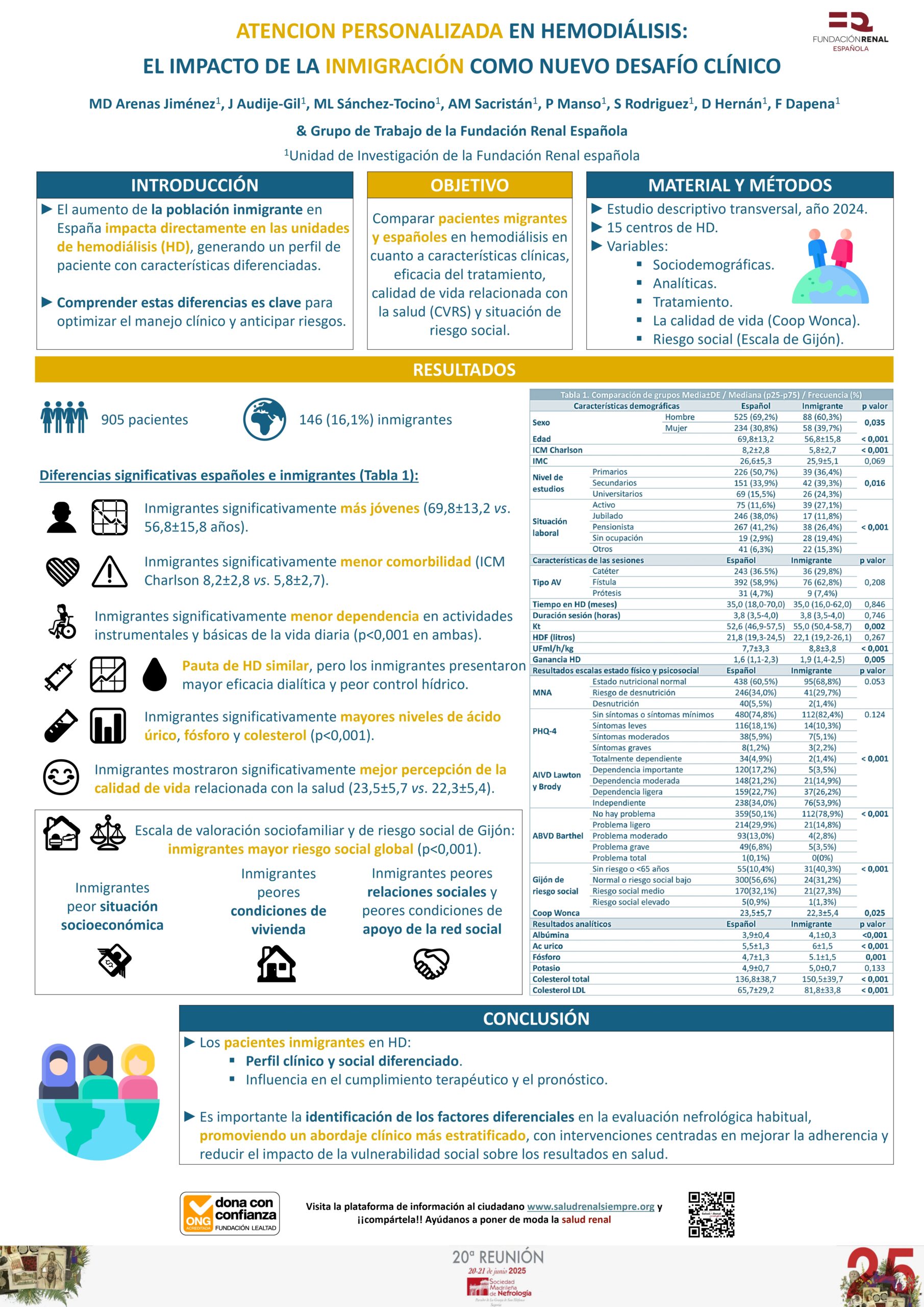 Uno de los pósteres que la Fundación ha llevado al congreso, se centraba en la Atención personalizada en hemodiálisis: el impacto de la inmigración como nuevo desafío clínico, una comparativa entre pacientes inmigrantes y españoles en hemodiálisis, incluyendo a 905 personas (16,1% inmigrantes). Los inmigrantes eran más jóvenes, con menos comorbilidades y mayor eficacia dialítica, aunque con peor control hídrico y niveles más altos de ácido úrico, fósforo y colesterol. Percibieron mejor calidad de vida, pero presentaron mayor riesgo social, especialmente en aspectos económicos y de vivienda. Resultados que ponen de manifiesto una vez más la necesidad de realizar un abordaje clínico individualizado que considere estos factores sociales para mejorar la adherencia y los resultados en salud.