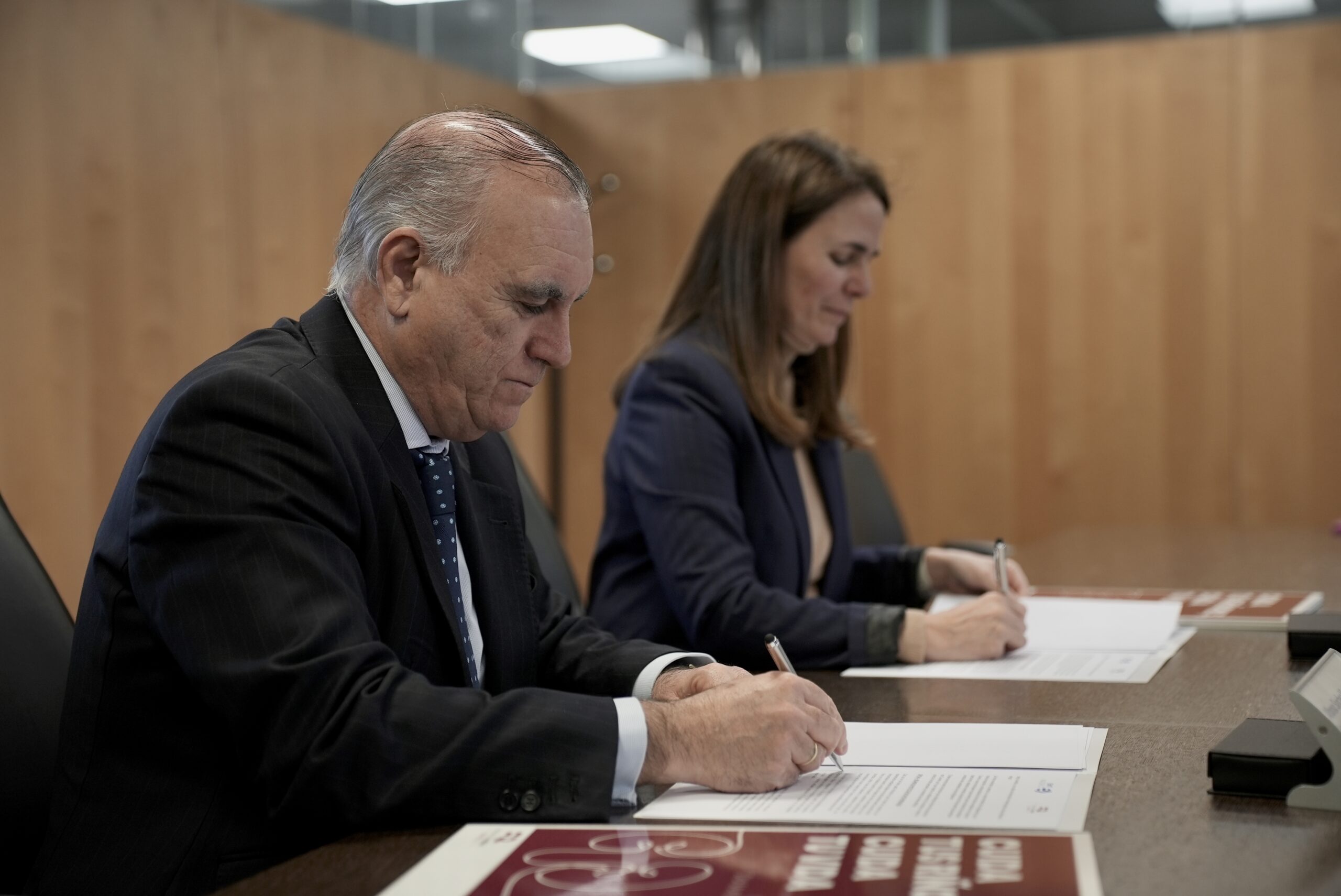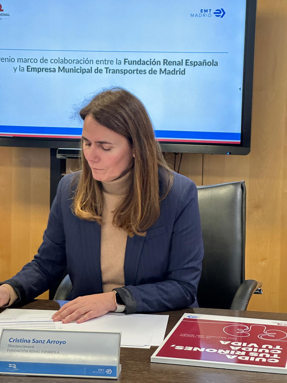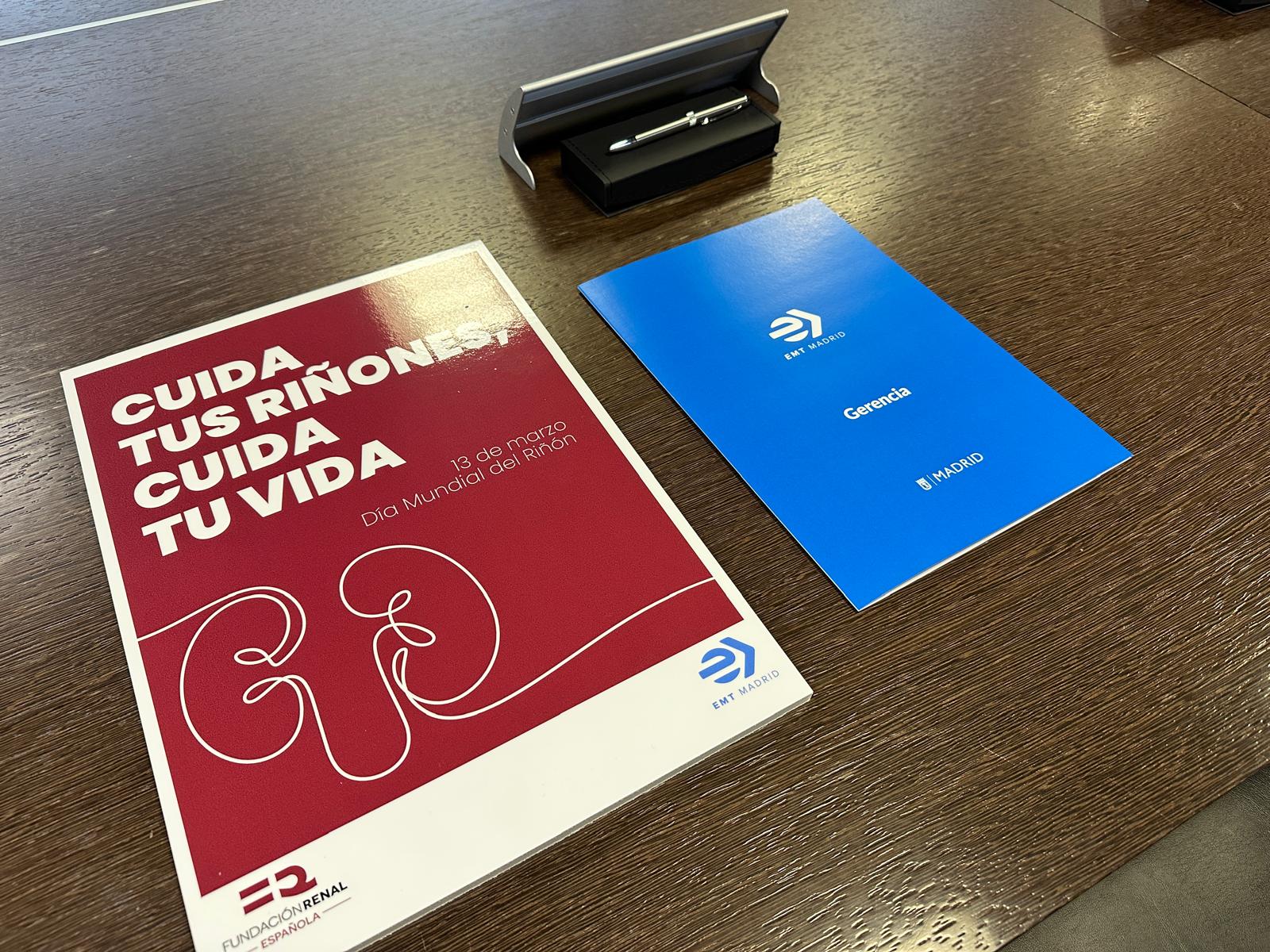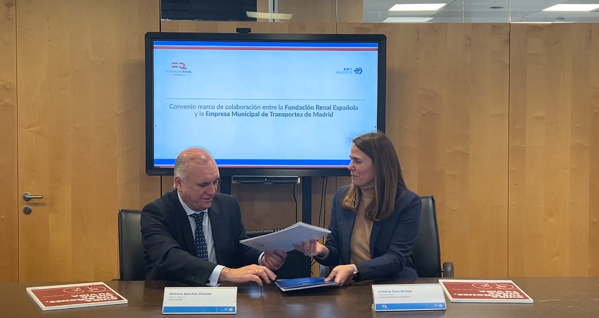 El director gerente de EMT, Alfonso Sánchez, y la directora general de la Fundación Renal Española, Cristina Sanz, han firmado esta mañana un convenio de colaboración entre ambas entidades dirigido a fomentar la salud renal tanto entre el millón setecientos mil de usuarios diarios de sus 2.100 autobuses, como entre los más de 10.000 trabajadores de la EMT.