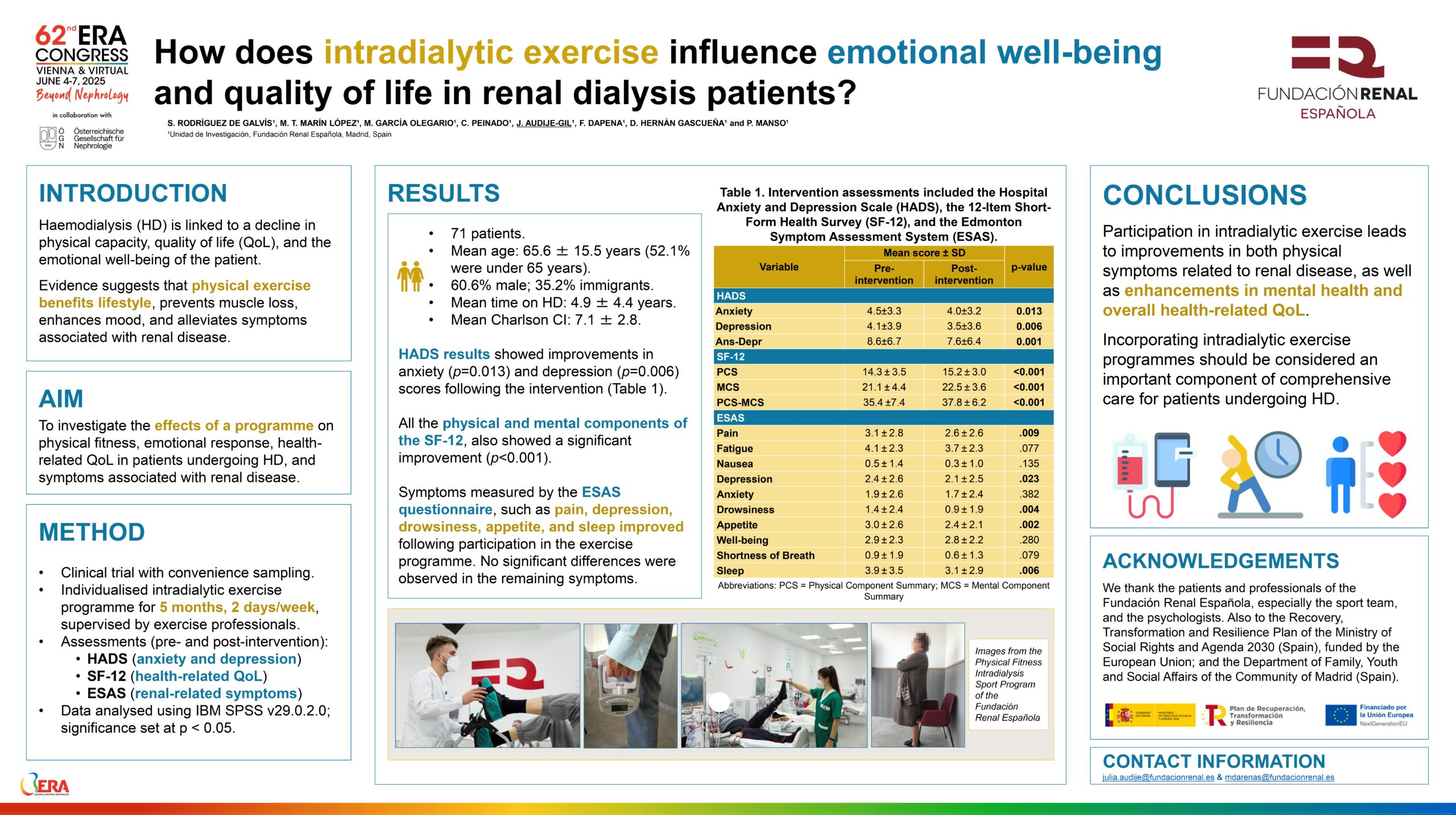 71 pacientes participaron en ejercicios supervisados dos veces por semana durante 5 meses. El impacto de este programa de ejercicio intradiálisis recogido en el estudio How does intradialytic exercise influence emocional well-being and quality of life in renal dialysis patients? fue positivo a la hora de mejorar significativamente la ansiedad, depresión, calidad de vida (QoL) y varios síntomas relacionados con la enfermedad renal, como el dolor y la somnolencia. Estos hallazgos sugieren que el ejercicio intradiálisis mejora tanto la salud física como mental de los pacientes, por lo que debería ser parte del tratamiento integral en hemodiálisis.