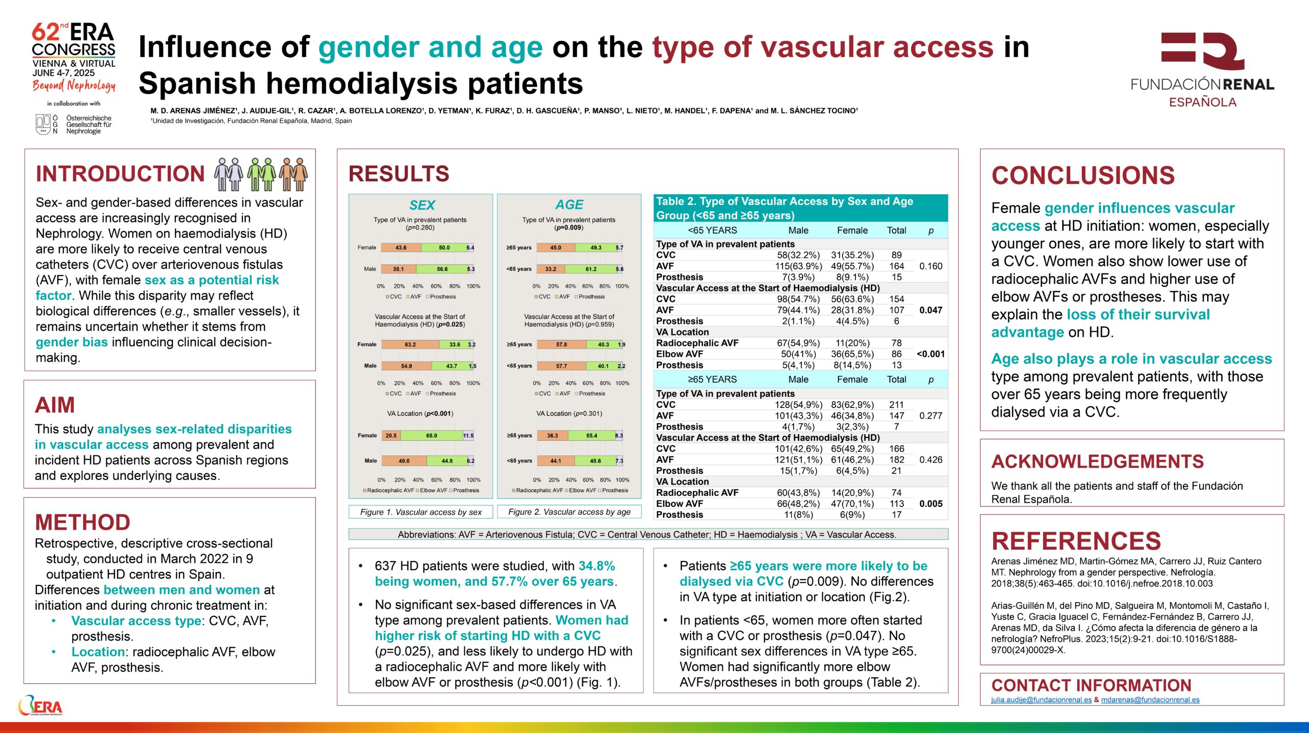Influence of gender and age on the type of vascular access in spanish hemodialysis patients es el primer e-poster que analiza las diferencias de género y edad en el acceso vascular en pacientes en hemodiálisis en España. Las mujeres, especialmente las menores de 65 años, tuvieron más probabilidades de iniciar la diálisis con un catéter central (CVC) en lugar de una fístula arteriovenosa (AVF). También, fueron menos propensas a usar fístula arteriovenosa radiocefálica y más propensas a usar fístula arteriovenosa en el codo o prótesis. Los pacientes mayores de 65 años también iniciaron con más frecuencia con un catéter central. Diferencias que deberían ser consideradas en las decisiones clínicas.