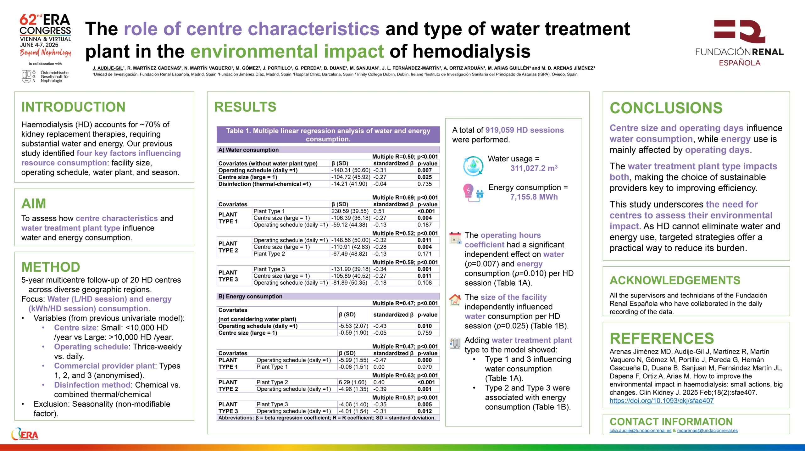 Durante cinco años se evaluó el consumo de agua y energía en 20 centros de hemodiálisis. El análisis multivariante, recogido en el estudio The role of centre characteristics and type of water treatment plant in the environmental impact of hemodialysis y presentado en este congreso en forma de e-poster, mostró que los centros más grandes y con mayor actividad diaria consumían menos recursos por sesión. Las horas de funcionamiento influyeron en ambos consumos, y el tamaño del centro principalmente en el de agua. Al incluir el tipo de planta de tratamiento, también se observaron diferencias entre proveedores en su impacto sobre agua y energía. Estos resultados ponen de manifiesto la importancia de infraestructuras y proveedores más sostenibles para reducir el impacto ambiental de la hemodiálisis.