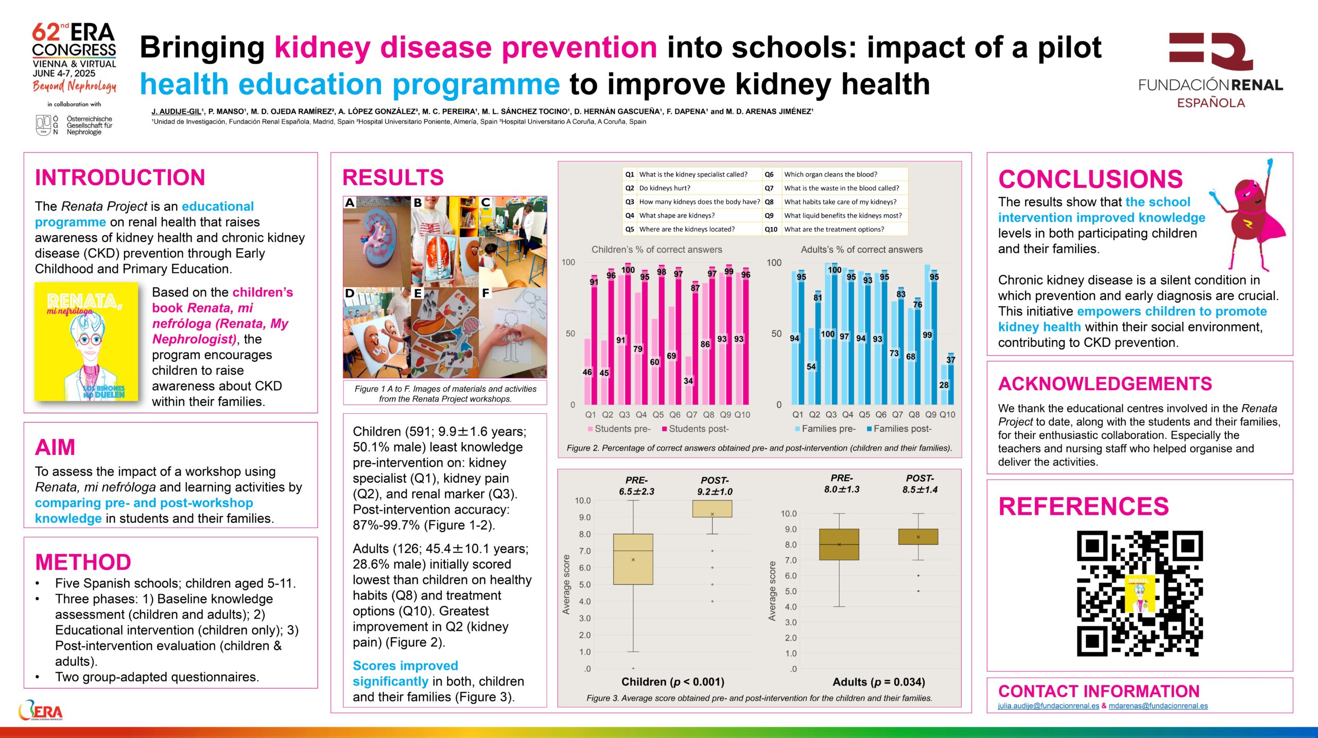 La primera de las comunicaciones orales presentaba el estudio Acercando la enfermedad renal a las escuelas: impacto de un programa piloto de educación sanitaria para mejorar los conocimientos en salud que evaluaba un proyecto educativo sobre salud renal en niños de 5 a 10 años en escuelas españolas que tenía el objetivo de promover hábitos saludables y prevenir la enfermedad renal crónica. En esta intervención los niños aprendieron sobre salud renal y compartieron, además, el conocimiento con sus familias y, tras ella, los conocimientos de los niños y de los adultos mejoraron considerablemente. La puntuación de los menores aumentó de 6,5 a 9,2 y la de los mayores de 8,0 a 8.5, evidenciando que los más pequeños pueden ser agentes efectivos de cambio, capaces de promover la prevención de la enfermedad renal en su entorno.