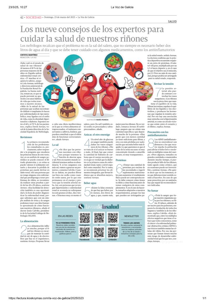 ¿Sabe cuál es el estado de salud de sus riñones? Bajo el desconocimiento que existe para poder responder a esta pregunta se encuentran cifras que, para los nefrólogos, resultan preocupantes. Al menos el 10 % de la población mayor de 18 años en España sufre enfermedad renal crónica. «Y muchas personas que la padecen ni siquiera lo saben», asegura Lola Arenas, nefróloga y directora asistencial de la Fundación Renal Española. La buena noticia, remarcan, es que se puede prevenir su aparición con unos hábitos de vida que todos tenemos a nuestro alcance. «Más de la mitad de las personas que llegan a necesitar diálisis o trasplantes lo hacen por enfermedades que son de tipo metabólico, muy ligadas con el estilo de vida, como la obesidad, hipertensión o diabetes. Suponen entre el 60 y el 70 % de los pacientes que tienen una enfermedad renal importante», explica David Arroyo, vocal de la Junta Directiva de la Sociedad Española de Nefrología.