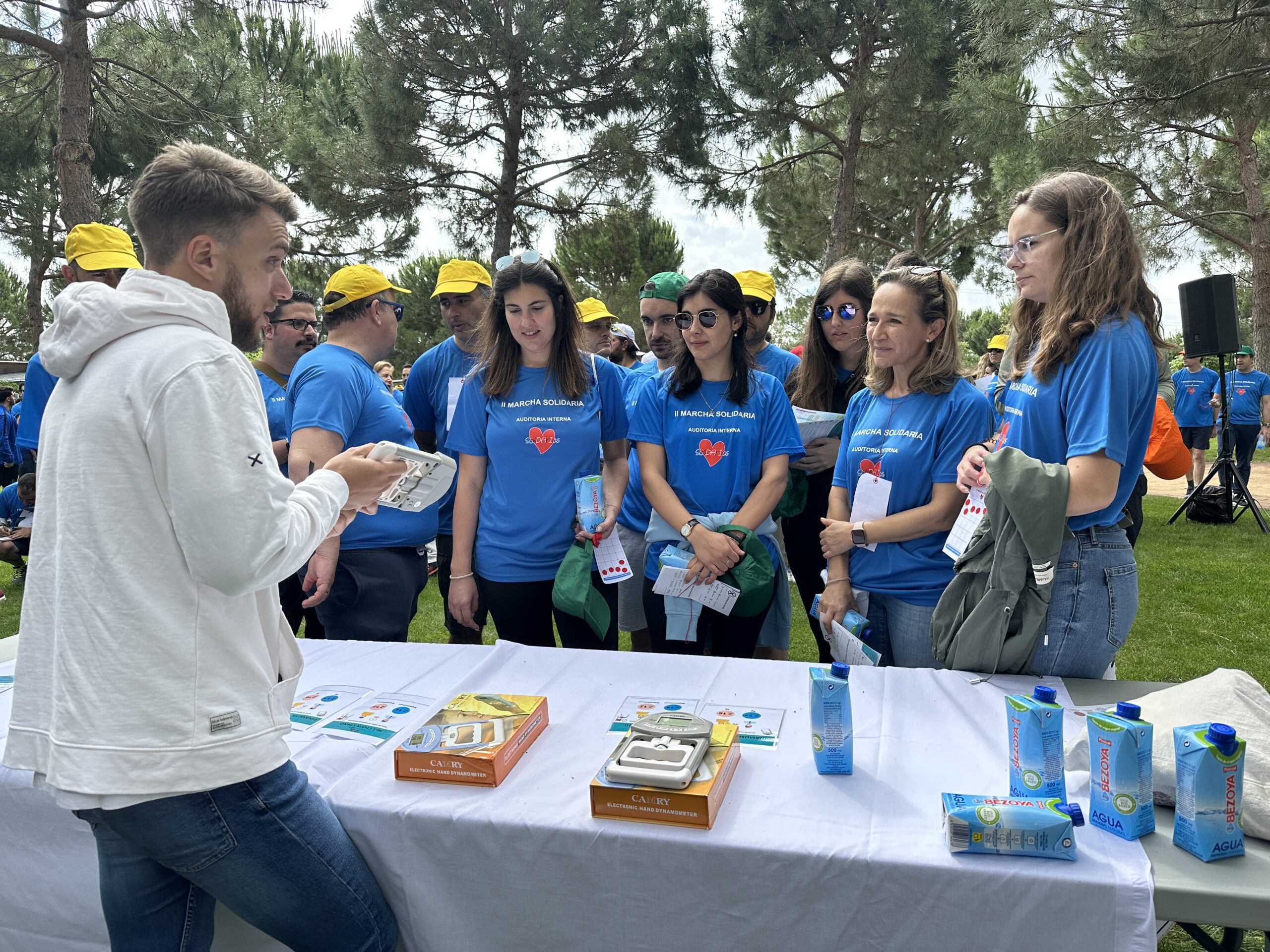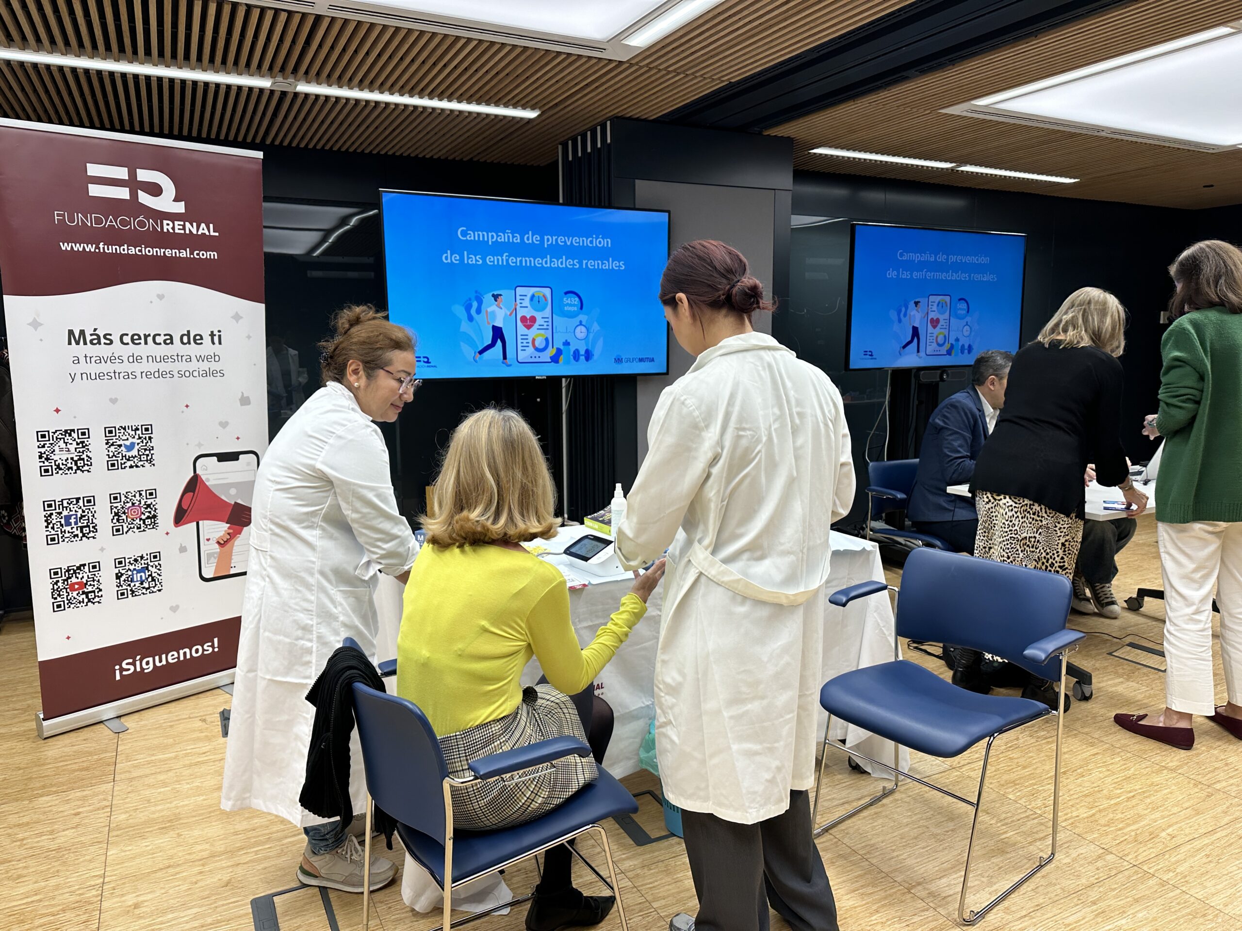 Pruebas de detección precoz en Mutua Madrileña: Como parte de la semana de la salud para empleados de la Mutua Madrileña, la Fundación instaló en sus oficinas un stand de salud renal donde se ofrecieron pruebas de cribado a los trabajadores de la compañía. Decenas de empleados se realizaron mediciones de tensión, análisis de gota de sangre, obteniendo en minutos información sobre su función renal. A quienes presentaron factores de riesgo se les dio consejos personalizados y se les recomendó seguimiento médico. La actividad tuvo una excelente acogida, con gran participación y consultas, logrando visibilizar la ERC entre personal de diferentes departamentos de la Mutua. Muchos comentaron que desconocían su presión arterial o nivel de creatinina antes de la prueba, y valoraron positivamente la oportunidad de saber cómo estaban sus riñones. Esta colaboración ejemplifica cómo la empresa y la Fundación pueden aliarse para proteger la salud de los empleados, integrando la prevención en la rutina laboral.