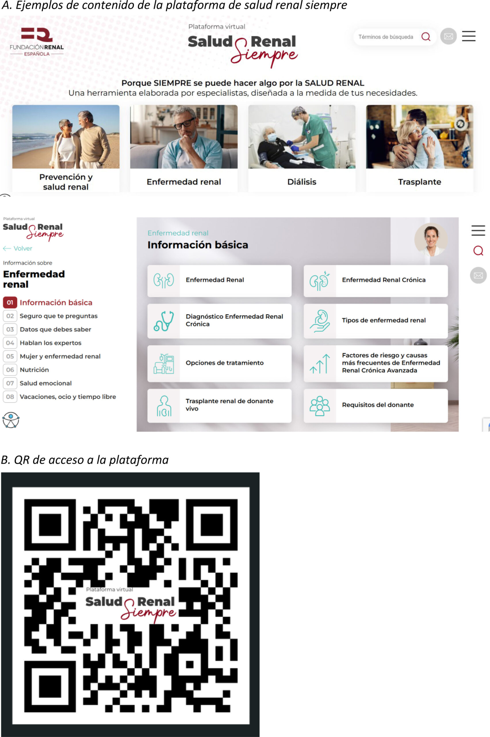 La plataforma Salud Renal Siempre nace en el año 2024 como una herramienta digital desarrollada por más de 60 profesionales, pacientes y cuidadores, que busca impulsar el empoderamiento del paciente, la toma de decisiones compartidas y la atención integral. Organizada en cuatro bloques temáticos (Prevención y salud renal; Enfermedad renal; Diálisis y Trasplante) la plataforma resulta funcional para el usuario al ofrecerle contenidos básicos y accesibles para la población general y grupos de riesgos. Tiene, además, recursos interactivos y espacios para formular preguntas, a la vez que proporciona una visión crítica a través de testimonios, casos reales, guías, etc.